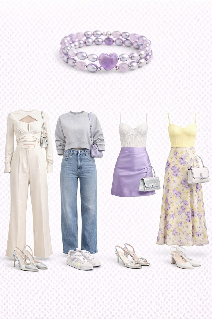 Smalka divrindu rokassprādze gaiši rozā–lavandas toņos, veidota no dabīgo akmeņu pērlēm un ar sirds akcentu. Dizains iedvesmots no rozā kakadu grācijas — maiga un izsmalcināta rota ikdienai un svētkiem.